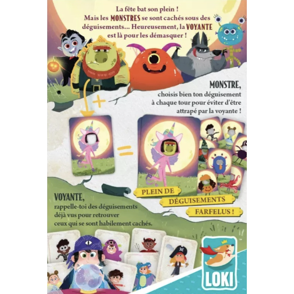 À chaque tour, la voyante pioche une carte Vision dévoilant un déguisement interdit aux monstres. Ces derniers doivent alors rapidement changer de costume sans utiliser ceux déjà révélés. Si l’un d’eux est démasqué, la voyante remporte la partie. Sinon, les monstres gagnent… à condition d’être parfaitement déguisés et synchronisés !