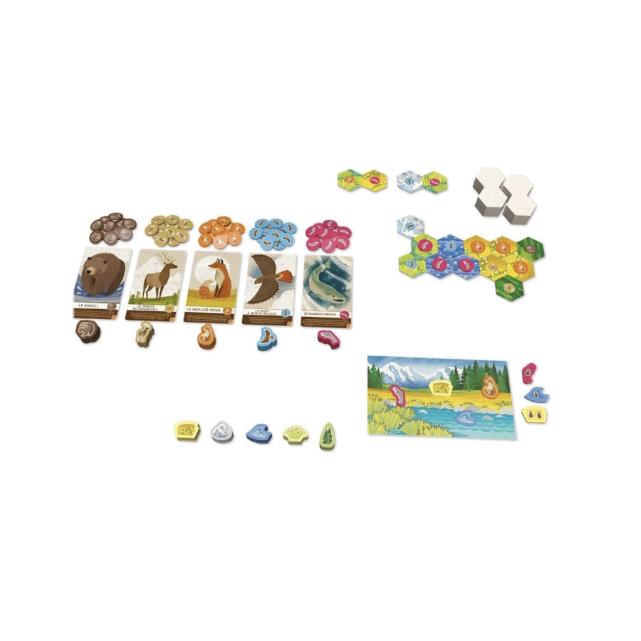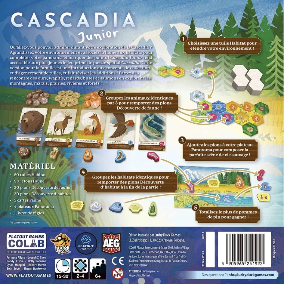 Cascadia Junior permet aux plus jeunes joueurs de découvrir le puzzle spatial du jeu de société primé Cascadia ! Lorsqu’ils font des correspondances, ils gagnent des jetons d’observation de la faune et de l’habitat qu’ils peuvent ajouter à leur tableau panoramique, où ils créeront leur propre image de la nature sauvage !