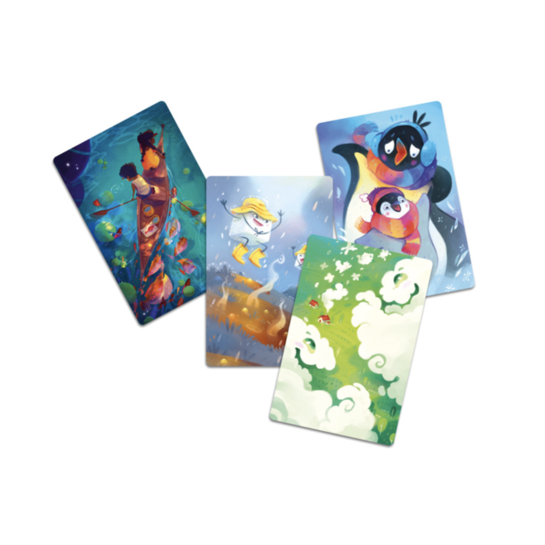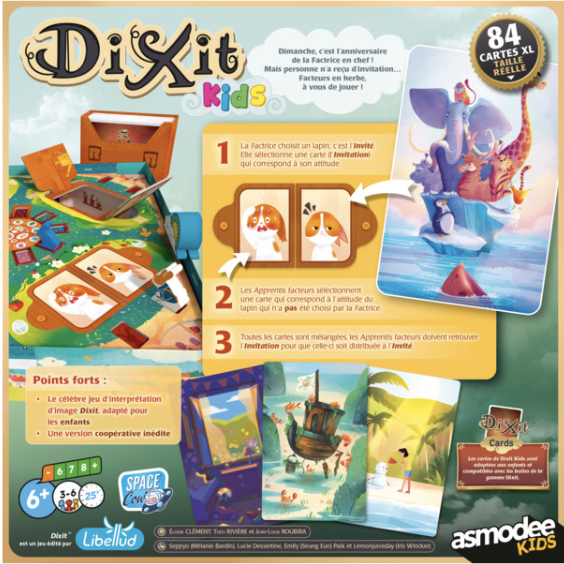 Les 84 Cartes XL du jeu Dixit Kids sont adaptées aux enfants et sont compatibles avec les autres boîtes de la gamme Dixit.