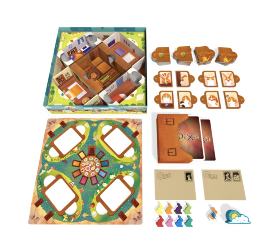 Dixit Kids est un jeu coopératif dans lequel vous devez inviter le plus de lapins possible à l’anniversaire de la Factrice en chef.