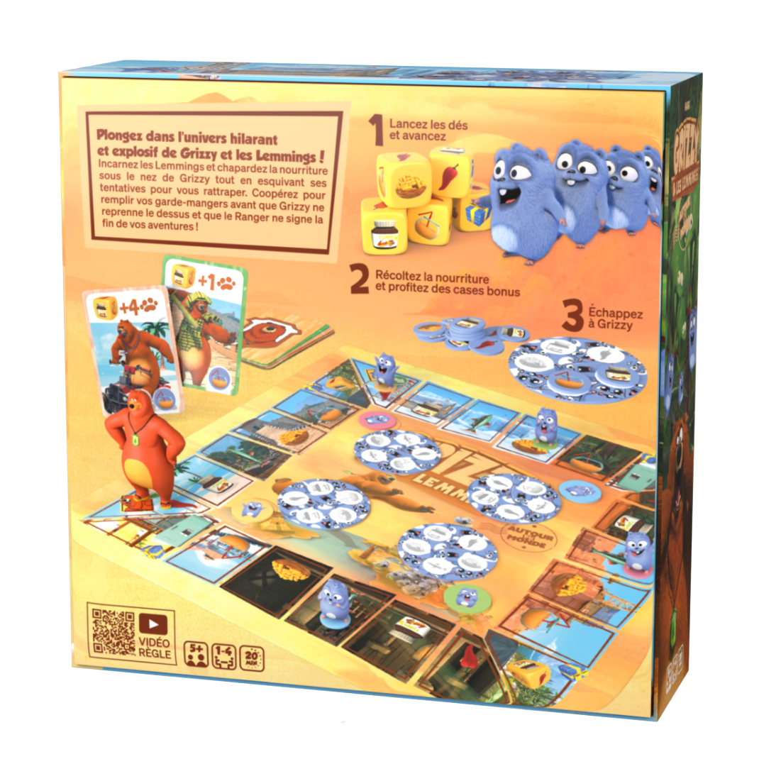 – Esquivez Grizzy : Le dernier dé fait avancer Grizzy selon la carte tirée. S’il rattrape un Lemming, celui-ci perd une partie de sa nourriture.
