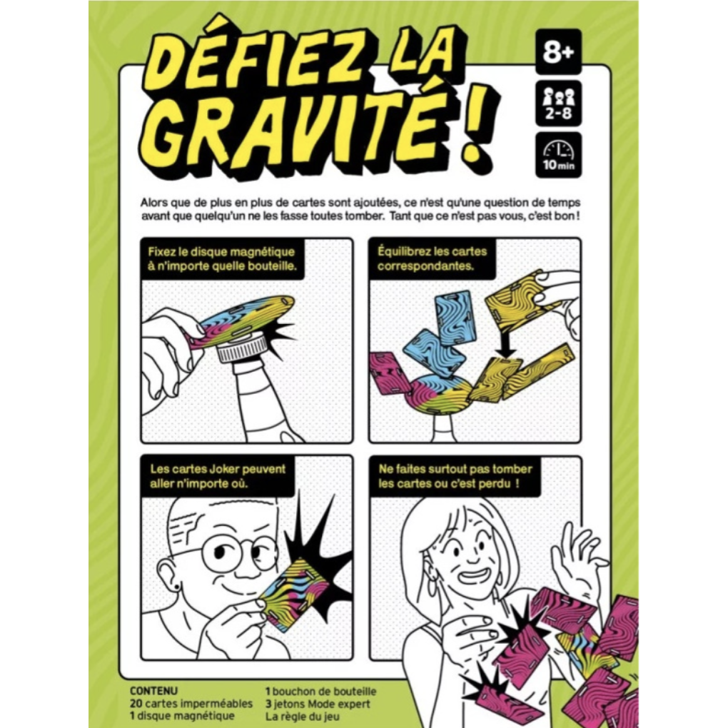 Instable est un jeu d’équilibre qui peut être joué sur n’importe quelle bouteille. Parfait pour les soirées jeux en famille, les anniversaires, les bars et bien plus encore !