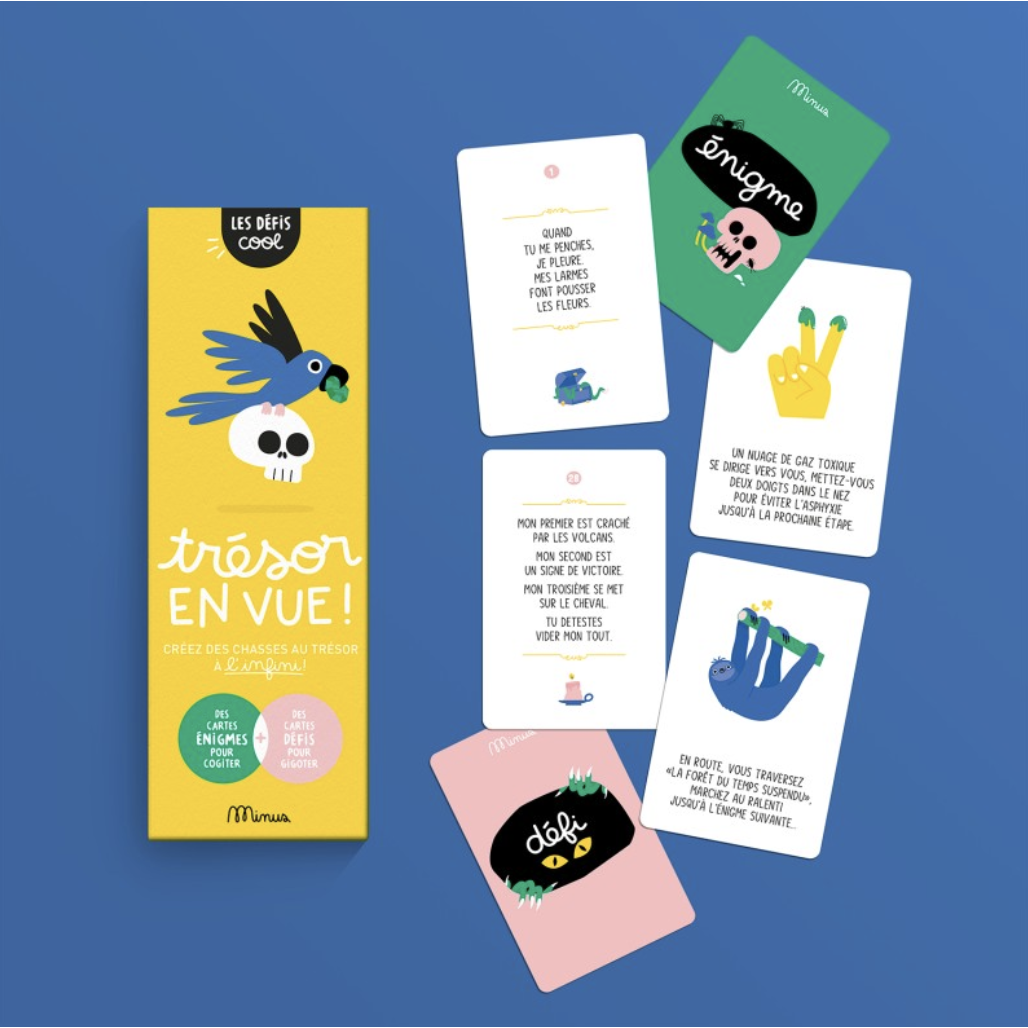 Voici TRESOR EN VUE, la boîte hyper pratique pour organiser de la manière la plus simple possible une infinie possibilités de chasses au trésor, chez vous !