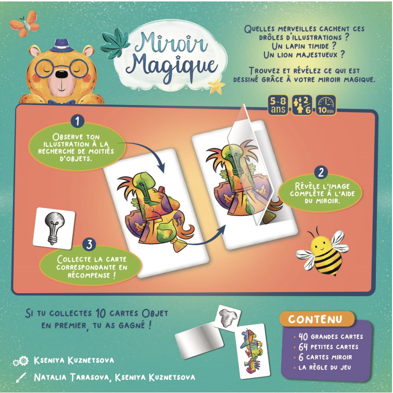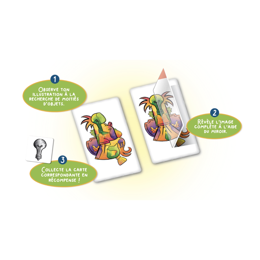 Découvrez qui vous attend de l’autre côté du miroir ! Transformez les moitiés d’image en un tout à l’aide des cartes miroirs : une ligne courbe se révèle être une aubergine, et un drôle de gribouillis est en fait un palmier géant. <